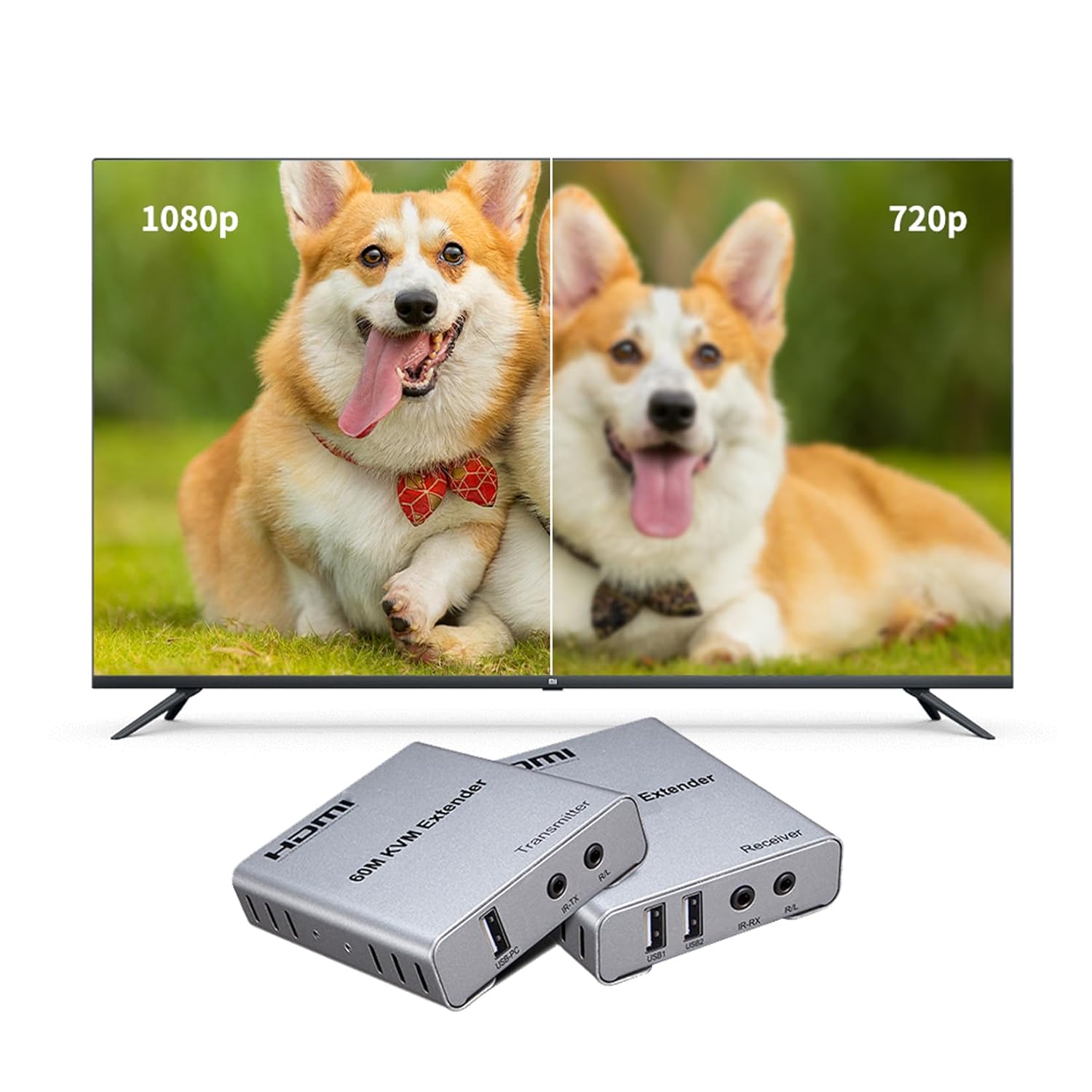 BolAAzuL 1080P@60Hz HDMI KVM USB Extender Over RJ45 Single Cat5e/6 Ethernet Cable This HDMI KVM extender is capable of transmitting signals up to a distance of 60 meters. It enables you to place your workstation up to 60m away from a server a USB keyboard and a mouse console. This HDMI USB KVM extender extends HDMI & USB-based signals over a single CAT5E/6 cable. With up to 1080P resolution, you can get a sharp and clear video even on large monitors. With this device, you can easily extend your HDMI signal without any loss in quality. It is ideal for use in large conference rooms, classrooms, and other settings where long-distance transmission is required. Features: 196FT/60M HDMI KVM Extender: The BolAAzuL USB HDMI KVM Extender lets you control a PC from up to 196ft/60m away over a single qualified Cat 5e or Cat 6 cable connection, with uncompressed 1080p HDMI video. Uncompressed 1080P@60Hz Resolution: A flexible solution for powering large high-definition displays remotely, this HDMI USB extender supports uncompressed 1080p or 1920x1200 video resolutions at maximum distance. Local HDMI Loop-Out: The "loop out" port on the extender provides an additional HDMI output, allowing you to connect a secondary display or monitor. 2 Ports USB2.0 KVM: Support remote control of a computer system through keyboard and mouse. Durability & Reliability: Compact design and aluminum alloy metal shell are good for heat dissipation, and wear resistance, and can extend its service life. Plug & Play: Easy to carry, install, and use, no software and extra settings needed. Specifications: 1. Extend USB & HDMI signal up to 60M. 2. Supports resolutions up to 1080P/60hz. 3. Video and audio over HDMI port supported. 4. Supports point-to-point connection. 5. Support HDMI loop out on TX for monitoring. 6. Supports USB mouse and keyboard extension over ethernet cable. 7. HDMI KVM extender with IR control. Package contents: HDMI KVM extender TX *1 HDMI KVM extender RX *1 5V power adapter *2 IR cable *2 User manual *1