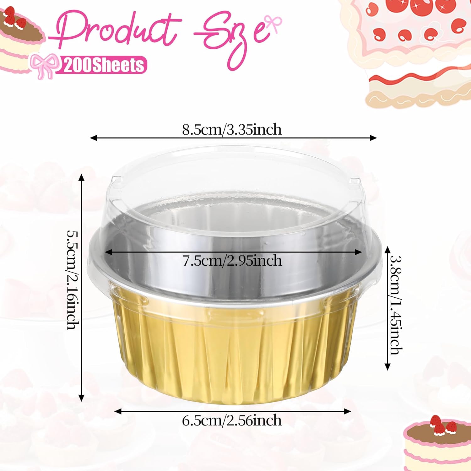 Product Name: aluminum pans with lidsMaterial: AluminumColor: GoldProduct Dimensions (cm): Length 8.5cm/3.35inch, Width 5.5cm/2.16inchPackage Contents: 200 pieces gold foil cupcake liners (200 mini cake pans + 200 lids)