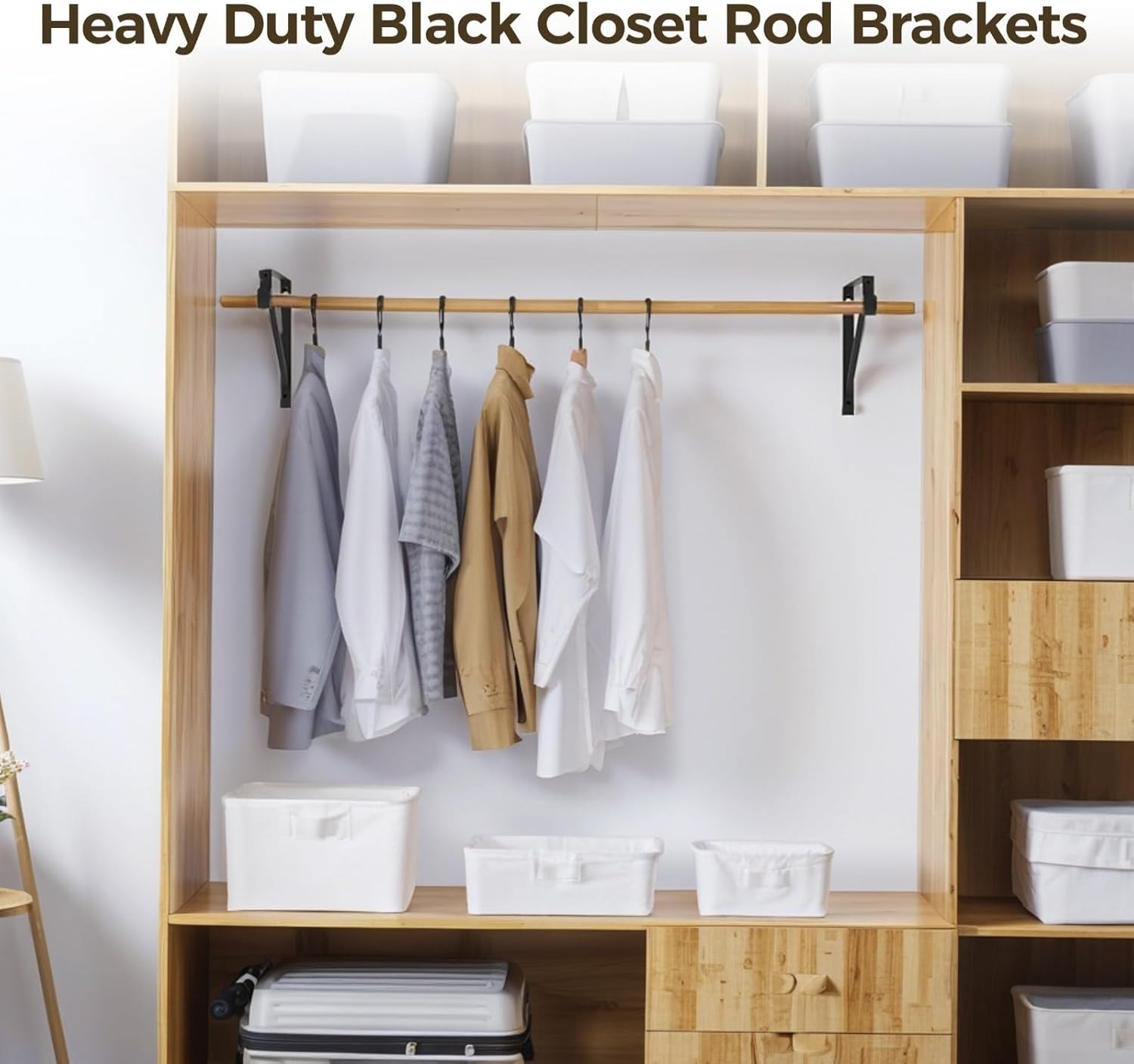 Color: black Material: metal Product size: 11 x 11 Inches Package Includes: Closet Rod Bracket x 4 Note: - Please refer to the measurement. Tiny measuring error is allowable in normal range. - There might be a little color difference due to the monitor, camera or other factors, please refer to the physical item.