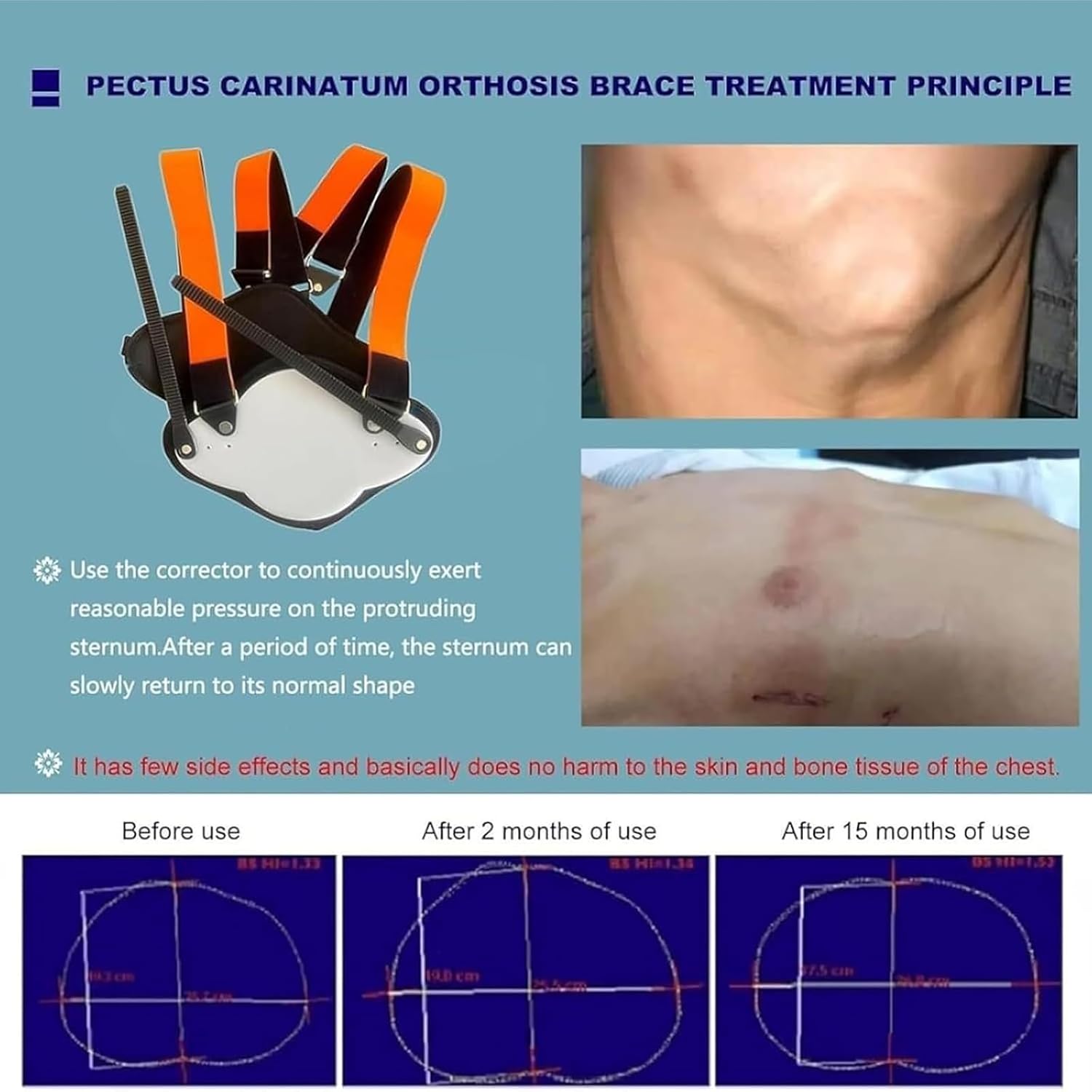 Product Description: Our adjustable orthotic brace is designed to provide gentle, sustained pressure on protruding sternums, gradually guiding them towards a more natural position over time. Meticulously crafted for comfort, it supports postural correction and personal confidence. Pectus excavatum is not merely a physical condition; it impacts overall health: Physiological Effects: In some instances, the deformity may compress the heart and lungs, leading to fatigue, shortness of breath, or increased susceptibility to respiratory infections. Psychological and Postural Effects: Many individuals experience discomfort or social anxiety due to the chest's appearance. This often leads to adopting a hunched posture to conceal the protrusion, which can further strain the back and shoulders. Our brace is designed to support correction, helping improve posture and confidence. Product Specifications: Product Name: Pectus Excavatum Orthosis Material: Resin Panel + Composite Breathable Fabric Suitable For: Adolescents and adults with mild to moderate pectus excavatum. Size Guide: For optimal results, match your height and weight to our recommendations: XS: Height under 1.0m | Weight 5-12.5kg S: Height 1.0–1.25m | Weight 12.5–20kg M: Height 1.25–1.4m | Weight 20–30kg L: Height 1.4–1.6m | Weight 30–40kg XL: Height 1.6–1.8m | Weight 45–50kg+ Note: Should your measurements fall precisely on the boundary (e.g., height 1m, weight 12.5kg), we recommend selecting the smaller size (in this case, S) for a more secure fit. Package includes: 1 x Orthotic Brace