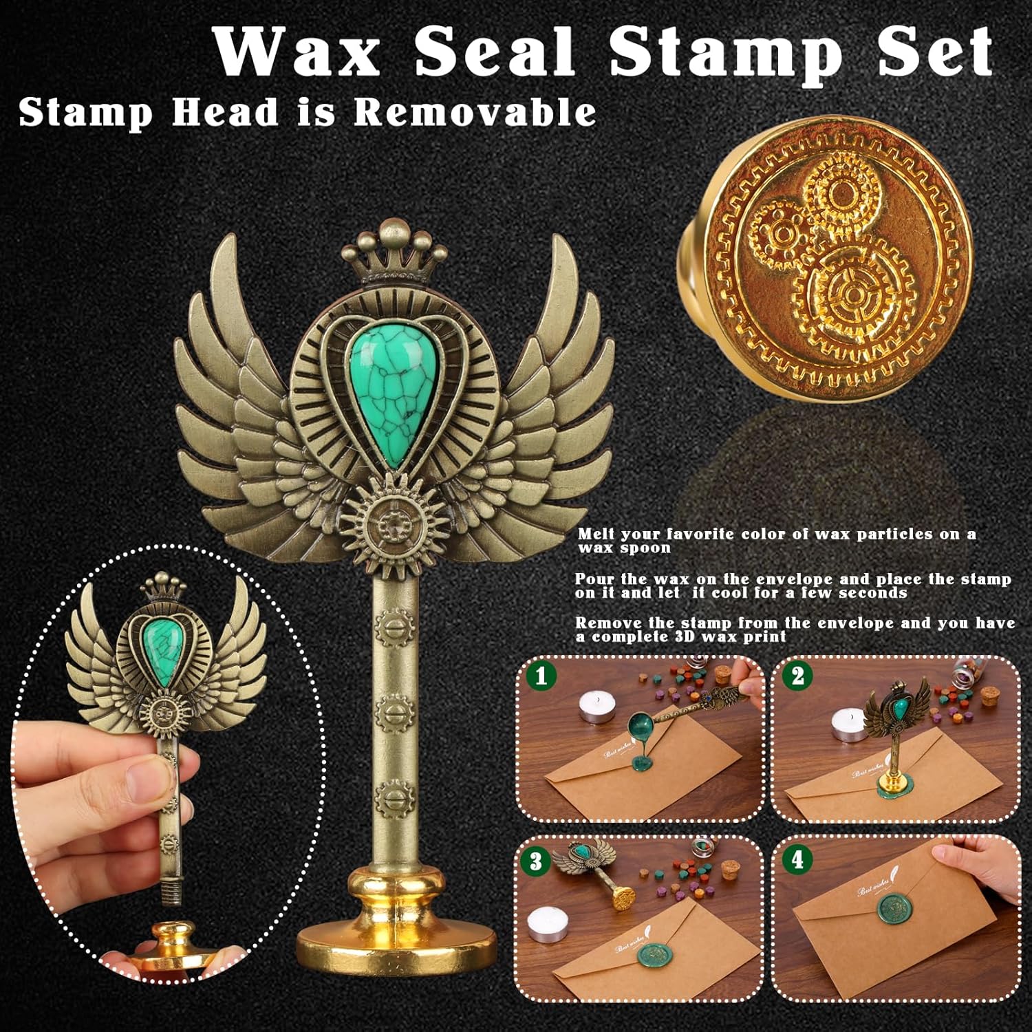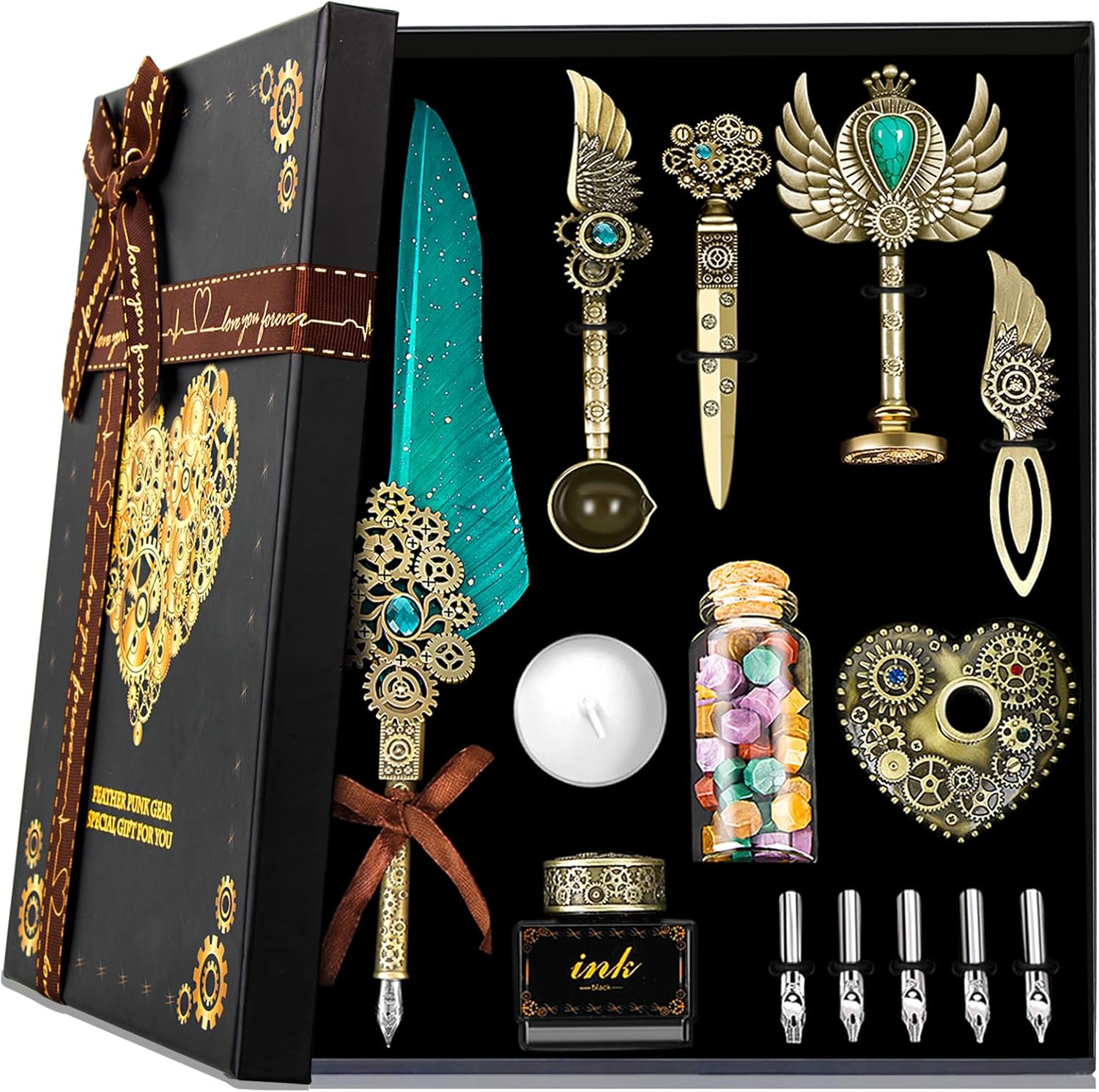 | Included Components | quill pen, ink(Black), love pen holder, replaceable stainless steel nibs, envelope, letter paper, bookmark, gear design Seal, color wax beads, white wax, melting wax spoon, envelope opening tool, mechanical punk packaging box |