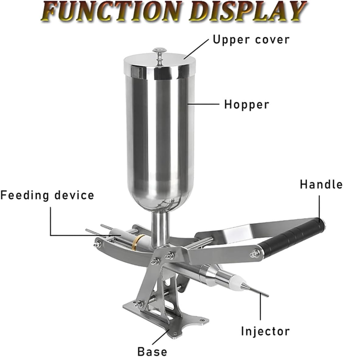 This 5L manual filling machine is designed for efficiently injecting fillings into donuts and churros. It features a durable 304 stainless steel construction, ensuring strength, corrosion resistance, and safety for extended use. With a large 5L capacity hopper, it minimizes frequent refilling, enhancing productivity. The ergonomic handle and design reduce user fatigue, while the included nozzles—short and long options—allow for versatile filling applications. Easy to operate by inserting the nozzle and gently pulling the handle, it is also space-saving with a compact Y-shaped base for convenient storage. Assembly is straightforward, requiring only the attachment of the hopper and nozzles. Specifications include: Material: 304 Stainless Steel, Control Type: Manual, Capacity: 5L/5.28qt, Short Nozzle Length: 7.5cm/2.95in, Long Nozzle Length: 19cm/7.48in. The package includes the machine, nozzles, and an English manual with all necessary assembly accessories.