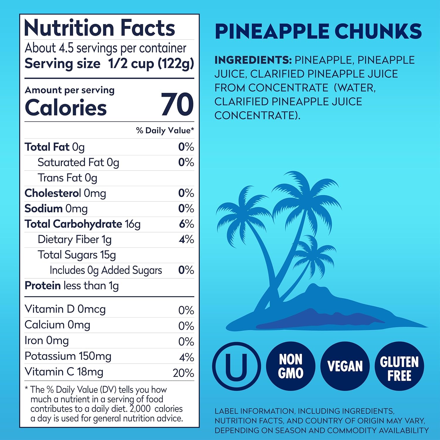 Dole Pineapple Chunks in 100% Pineapple Juice** are packed in an easy-to-open can, keeping the cut pineapple fresh and ready to be enjoyed at any time. With a boost of Vitamin C, these canned pineapple chunks are made with the nutritional goodness of real fruit for the ideal snack whenever you're craving a sweet treat with lower sugar. Dole Pineapple Chunks are great by themselves, as a topping, or in fruit salads, smoothies, or homemade desserts. You can even enjoy them straight from the can. With Dole, you can have the delicious taste of refreshing fruit anytime, anywhere. Dole Packaged Foods, LLC, is a world leader in growing, sourcing, distributing, and marketing fruit and healthy snacks in four core categories: Beverage, Snacks, Frozen, and Pantry. As a purpose-driven company, Dole has 3 areas of focus: increasing access to good food globally and reducing sugar, reducing carbon emissions and organic waste in our operations, and creating shared value amongst all stakeholders. *Not a low-calorie food. See nutrition facts for sugar and calorie content **With citric acid and clarified juice ***No genetically modified (or engineered) ingredients