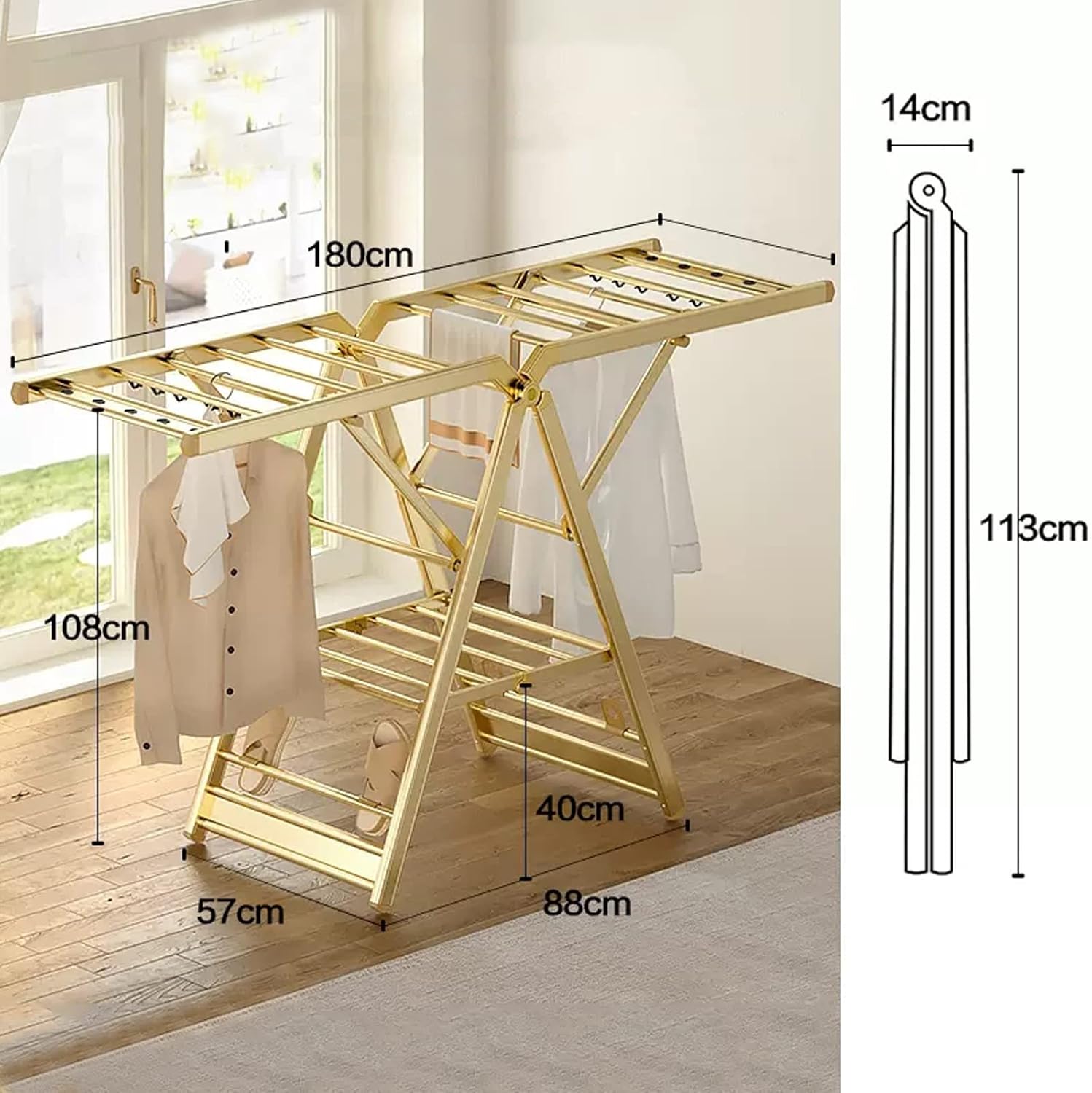 Folding drying rack, made of aluminium alloy, no rust, no deformation, no shaking, indoor and outdoor folding drying rack. Free of installation, it is designed to support high weights and high volumes of clothes. Use for living room, bedroom, balcony, outdoor drying Name: Folding drying rack Material: aluminium alloy Craftsmanship: oxidation resistant Colour: d / Silver Size: 180x108x88x57cm 113x14cm Weight capacity: 150kgFeatures: made of aviation aluminium alloy, waterproof, wear-resistant and rustproof, lightweight design, easy to fold and move, no installation, one ladder for two uses Applications: for drying clothes on balconies, living rooms, bathrooms, etc., bedding, flat drying, pillows, towels, etc., baby nappies, towels, shoes, socks, clothes, bedding and other items in one place Package includes 1x folding drying rack