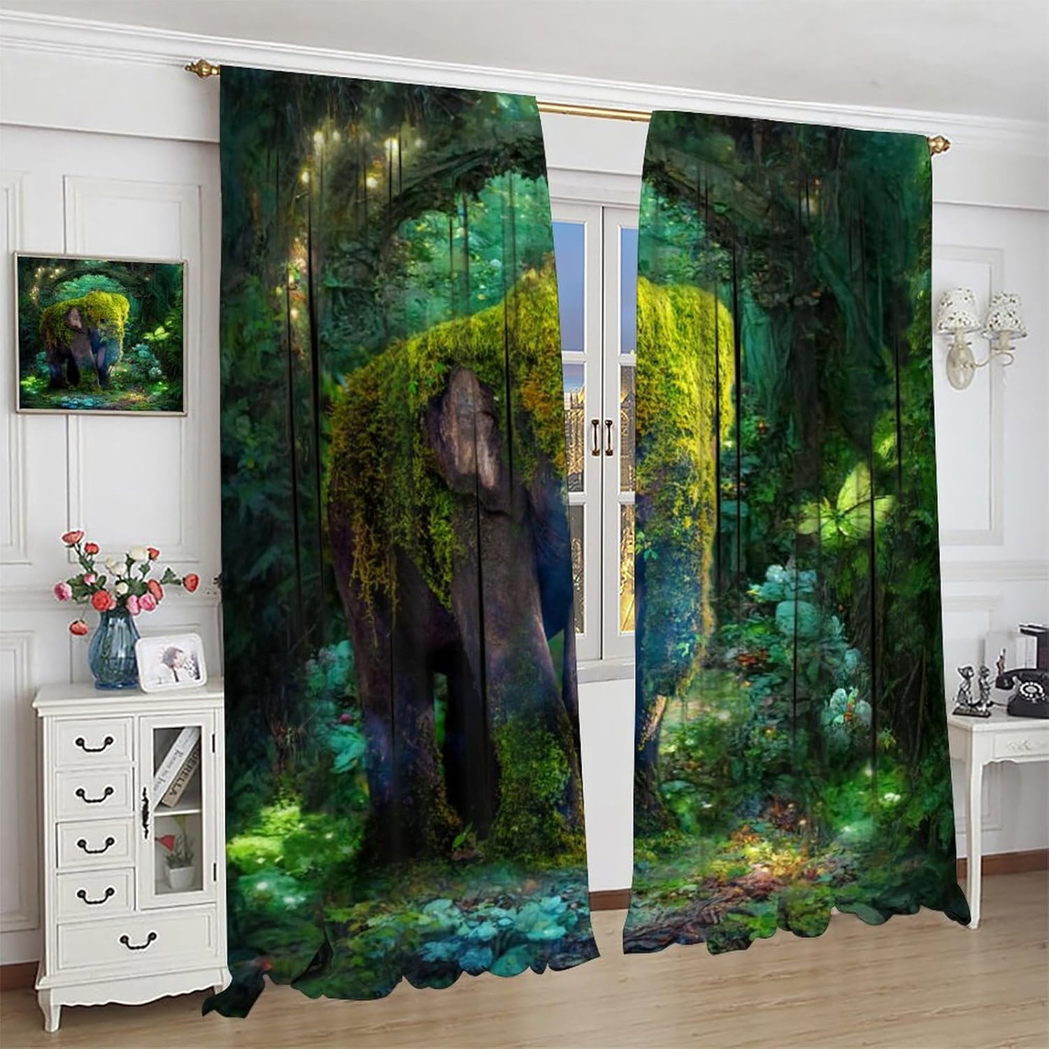 brebasf Funny Forest Wildlife Elephant Patterned Blackout Curtains Comes in eight sizes: Total size: 45" L × 42" W (114cm × 107cm),Includes two pieces, each of which measures:45" length × 21" width (114cm × 53.5cm). Total size: 54" L × 42" W (137cm × 107cm),Includes two pieces, each of which measures:54" length × 21" width (68.5cm × 53.5cm). Total size: 63" L × 42" W (160cm × 107cm),Includes two pieces, each of which measures:63" length × 21" width (160cm × 53.5cm). Total size: 63" L × 55" W (160cm × 140cm),Includes two pieces, each of which measures:63" length × 27.5" width (160cm × 70cm). Total size: 63" L × 63" W (160cm × 160cm),Includes two pieces, each of which measures:63" length × 31.5" width (160cm × 80cm). Total size: 72" L × 63" W (183cm × 160cm),Includes two pieces, each of which measures:72" length × 31.5" width (183cm × 80cm). Total size: 63" L × 72" W (160cm × 183cm),Includes two pieces, each of which measures:63" length × 36" width (160cm × 91.5cm). Total size: 84" L × 84" W (214cm × 214cm),Includes two pieces, each of which measures:84" length × 42" width (214cm × 107cm). This Fantasy Cartoon African Animal Elephant Tropical Plant Tree Green Leav Curtains liven up your indoor or outdoor spaces with a sense of airiness and beauty.Function: 1. Made of durable polyester fiber,soft and light. 2 The package includes: 2 panels. Curtain material: 98% polyester fiber. Provide a beautiful appearance for your bedroom,living room or office. 3. The curtains are grommet,which can be used with any standard curtain rods. Our products can be used as living room,room curtains. Mother's Day,Christmas,Halloween,Thanksgiving,New Year's party decorations at home! We believe that you will like this curtain as much as we do. If you are not satisfied with our products,please contact us,we will solve any problems encountered by the products for you,so that you are satisf