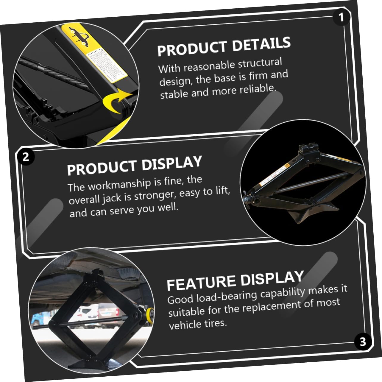 Package List 1 x jack 1 x rocker Characteristics -Weight: 5511 lbs Car Scissor Jack -Color: Black Car Repair Tools. -Material: Steel Tire Repair Tool. -Size:48.00X10.00X9.80cm/18.86X3.93X3.85in Tire Repair Jack -Note: The handle's color is random Auto Scissor Jack - The design of the jack is simple, easy to use, with better balance and easy positioning Hand Car Jack. - Made with exquisite craftsmanship, it has excellent durability and will not be easily damaged Auto Hand Cranking Jack. - Efficient and practical, fast and convenient, can be lifted in a short time, and help to quickly replace tires Scissor Jack. - It is made of high-performance materials to ensure and durability Auto Jack. - The solid base plate also ensures a secure footing, wear-resistant, strong construction made of steel, withstands high pressure Auto Repair Tool.Goods DescriptionTire Repair Tool With a reasonably designed structure, the jack is stronger as a whole and easy to lift.Auto Hand Cranking Jack It is safe and durable, has excellent texture, and has excellent load-bearing capacity.Car Scissor Jack It can serve you well.Car Jack This product is a hand car jacks, mainly made of materials