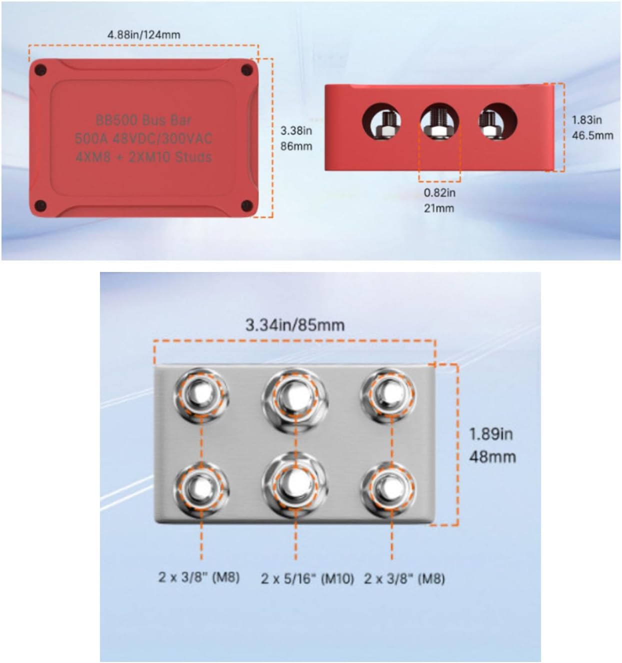 Item Type: Heavy Duty Power Distribution BlockConnector Type: Screw, 4 x 5/16in (M8), 2 x 3/8in (M10)Material: Plastic, Plated CopperColor: Red and Black (Red Wire Positive, Black Wire Negative)Continuous Rated Voltage: 12V DCMaximum Voltage: 300V AC, 48V DCMaximum Continuous Current: 500A DCApplication: Heavy power distribution block makes the circuit wiring neat, prevent electrical short circuit, suitable for cars, cars, trucks, ships, ships, RV, solar energy, etc.Package List:2 xPower Distribution Block12 x Sealing Ring16 x Screw