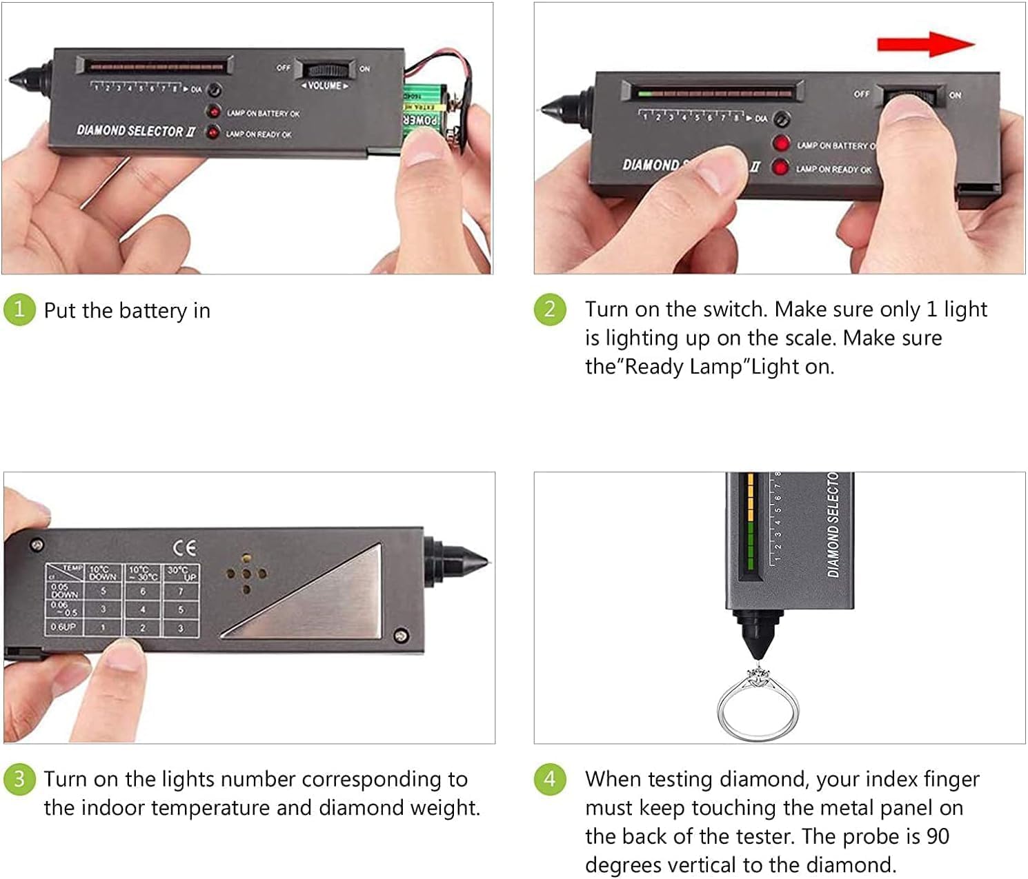 Diamond Tester, High Accuracy Professional Diamond Tester Pen, Diamond Tester Professional, Jewelry Diamond Tester Pen, Tds Meter Digital Water Tester and 60X Magnifying Glasses Tool Kit for Novice Expert Accuracy and portability are what we pursue all the time, we've been working on it to becoming your precision stewards. How To Test Diamond Turn on the switch. Make sure only 1 light is lighting up on the scale. Wait few seconds for the probe to heat up until Lamp on ready OK. Turn on the lights numbers corresponding to the indoor temperature and diamond weight. If don't know. Set 4 lights is lighting up on the scale. Use the diamond discriminator probe to make 90-degree contact with the measured object, and observe the indicator light change. It needs a little bit of force to stop it on the diamond surface and make full contact. If unsuccessful, please repeat the second step. Working power supply: DC 9 V battery ( included) Tds Meter Digital Water Tester - 1s Get Accurate Reasult for Home, Well, Tap Water Quality Test and More! 1. Insert into the water First, insert the TDS water tester into the water being tested 2. Press the ON button Second, press the ON/OFF button and wait for 1 second 3. Press the HOLD button Third, press the HOLD button and take it out 4. Read the reading Fourth, read the numbers on the display Package include: 1 x Jewelry tester 1 x Jewelry loupe 1 x Tds Meter Digital Water Tester 1 x Tweezers Popular among professionals, hobbyists, coin enthusiasts, and business owners alike. Excellent tools. Excellent Value. Great gift idea.