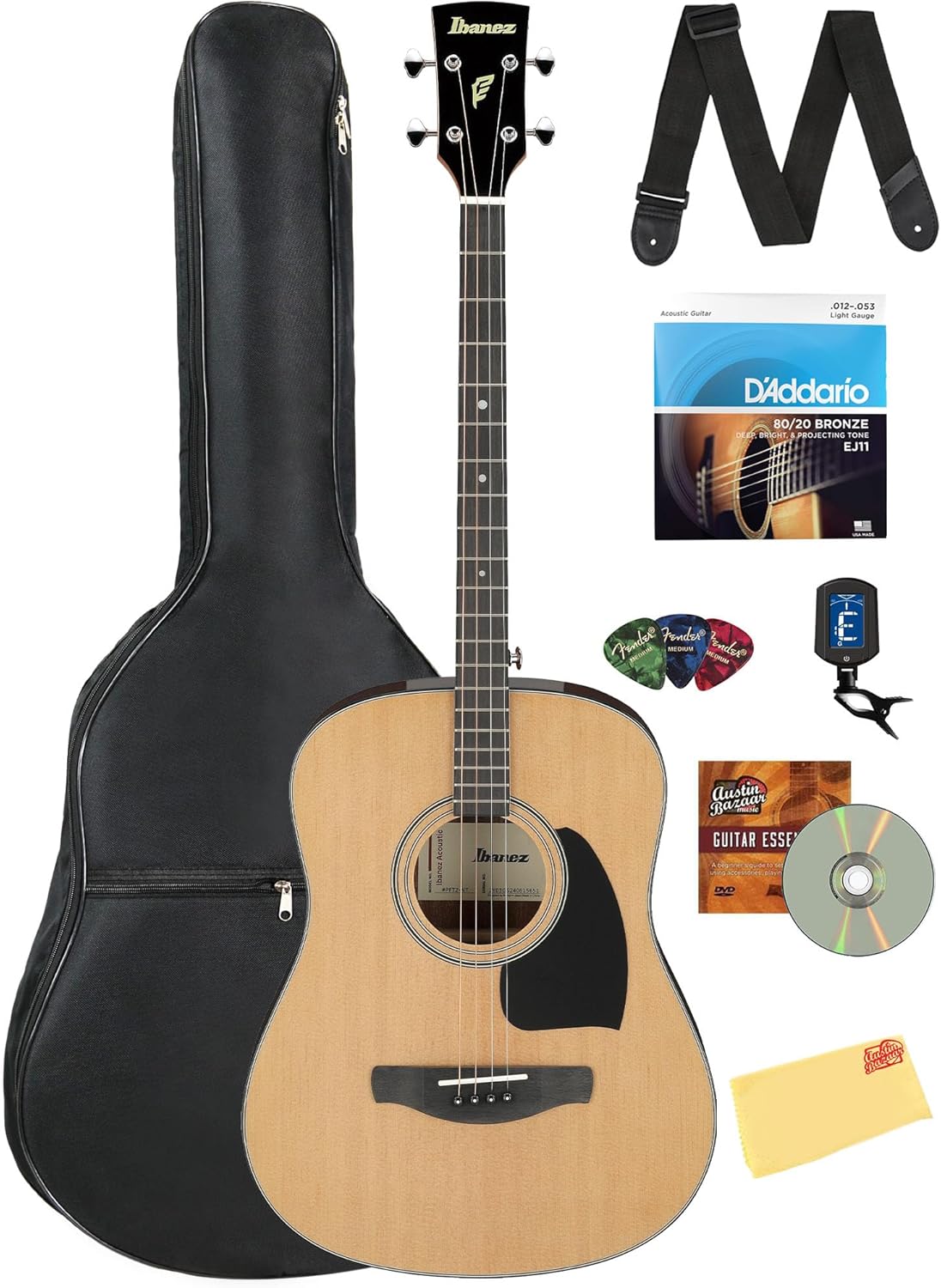 The Ibanez PFT2 Acoustic Guitar, part of the PF Performance Series, delivers professional features, rich tone, and reliable quality, all at an exceptional value backed by the trusted Ibanez name. Built with a spruce top, it offers pristine tonal clarity that complements the warm, full-bodied sound produced by its sapele back and sides. The Okoume neck provides enhanced playing comfort, while the purpleheart fretboard adds visual appeal and supports a rich, resonant midrange. A purpleheart bridge ensures efficient transfer of string vibrations to the body for a natural, warm tone. For added convenience, the PFT2 is equipped with Ibanez Advantage bridge pins, which are easier to insert and remove than traditional pins, with a special bulb-shaped end that improves grip and ensures a secure fit. Perfect for players seeking quality craftsmanship and balanced tone, the PFT2 is a reliable acoustic that sounds as good as it looks. Body Shape: Mini Dreadnought body Top: Spruce top Back & Sides: Sapele back & Sapele sides Neck: PFT Okoume neck Fretboard: Purpleheart fretboard Bridge: Purpleheart bridge Inlay: White dot inlay Soundhole Rosette: Black & White multi Tuning Machine: Chrome Open Gear tuners Number of Frets: 20 Saddle Material: Bone Bridge Pins: Ibanez Advantage Strings: D'Addario J66 String Gauge: .010/.014/.022/.032 String Space: 11mm Factory Tuning: 1A, 2D, 3G, 4C Austin Bazaar appreciates your purchase by adding essential accessories. This bundle contains a case to protect your guitar during travel, a tuner to keep your instrument in tune, a strap for comfortable playing, extra strings and picks for future use, an Austin Bazaar instructional DVD to provide tips and guidance and a polishing cloth to keep your gear in mint condition.