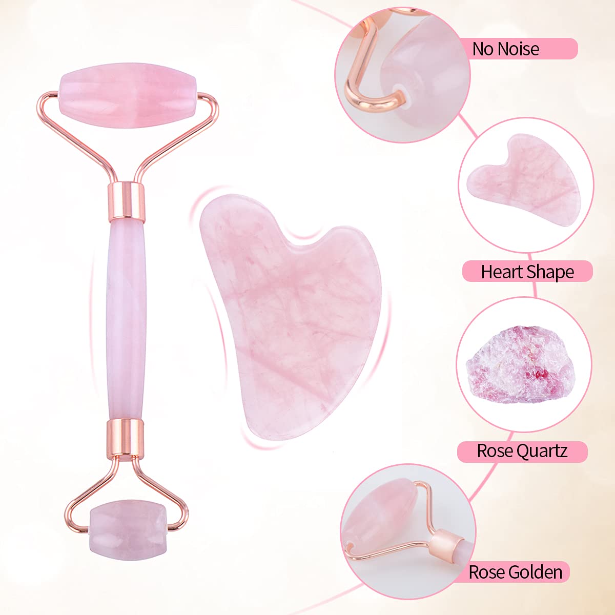 Features:Product: Jade roller and gua sha tool setMaterial: Rose quartzTechnology: PolishingResource: Natural jadeJade Roller Length: 14.5cmRoller Size: 5.5cm for big one / 4cm for small oneGua Sha Tool Size: 7.5cm x 5.5cmAbout Gua Sha:Guasha is a traditional and natural therapy in China. It’s based on the skin theory of traditional Chinese medical science. Guasha results in the appearance of small red spot called "sha", which will fade in 2 to 3 days. Remarkable efficiency produces by removing toxins from the body through draining energy from blood and stimulating toxic outside the skin. It can relieve ache and soreness of muscle quickly.How To Use Roller:1.Take a facial cleansing before rolling massage. Use small one for eye massage and big one for whole face. From bottom to up or inside to outside, you’d better to roll along one direction.2.Operation should be gentle, the slow rolling is soothing. Massage goes once for a day and for about 10-15 minutes every time. When you use skin care products, put the roller into hot water for heating, then roll to accelerate skin absorption.3.Put the roller into in refrigerator so the coldness of the item helps shrink pores. However, pay attention to control of hot and cold temperatures.Notes:1.The real color of the item may be slightly different from the pictures because of the brightness of your monitor and difference of every natural stone.2.It may be a little different from one to another since it’s a natural stone. Sometimes it may have ice crack or lines inside, which is normal for this product.3.Please allow a little measurement error since it’s measured manually.4.The roller is made of 100% natural jade, so it can be easily broken during the transportation. If you receive the damaged item, please contact us. Package Includes:1 x Gua Sha Tool1 x Jade Roller1 x Packing Box