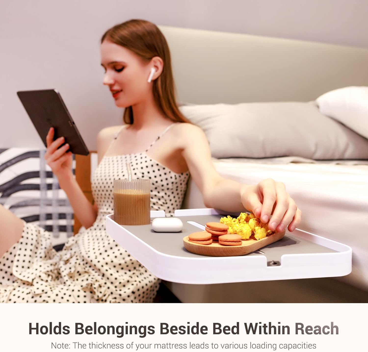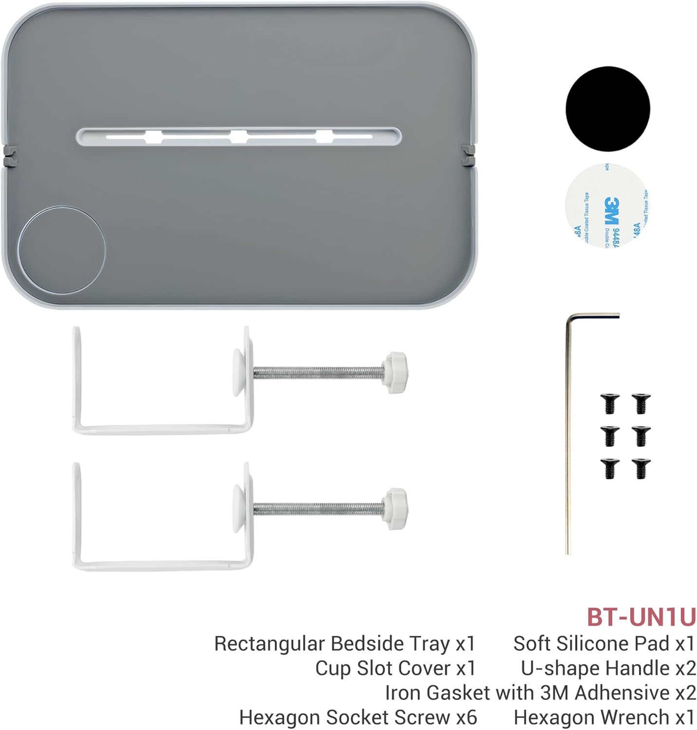 | Included Components | Rectangular Bedside Tray, Bigger piece of Rectangular Silicone Pad, Cup Slot Cover, Smaller piece of Circular Silicone Pad, U-shape Handle, Iron Gasket with 3M Adhesive, Hexagon Socket Screw, Hexagon Wrench |