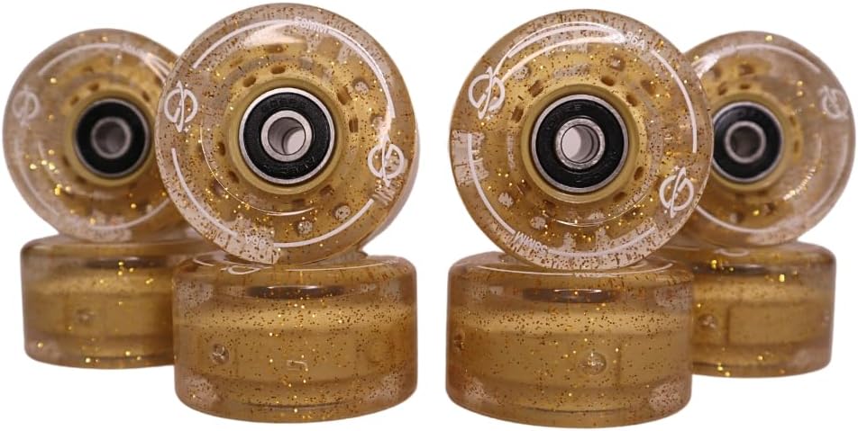 Bring radiant energy to every ride with the Starlight Gold LED Roller Skate Wheels from Galaxy Skates—where celestial style meets premium performance. This complete set of 8 dual-color LED wheels shines in a brilliant golden glow as you roll, creating a dazzling light show that turns every skate session into a cosmic adventure. Powered entirely by your movement, these wheels require no batteries or charging—just pure motion-activated brilliance that keeps you glowing with every stride. Perfect for roller rink sessions, outdoor cruising, or nighttime rides, the Starlight Gold wheels are crafted from high-quality 86A urethane, offering the perfect balance of durability, grip, and smooth performance on both indoor and outdoor surfaces. Their tough urethane construction resists wear while maintaining excellent control, so your wheels not only light up beautifully but also last longer. Pre-loaded with high-precision black carbon steel bearings, these wheels deliver a fast, reliable roll right out of the box. Whether you’re upgrading your Galaxy Skates or adding a luminous flair to another pair, the Starlight Gold LED Wheels bring unmatched style and performance. Shine brighter, roll smoother, and skate with stellar confidence—because your ride deserves to glow like the stars.