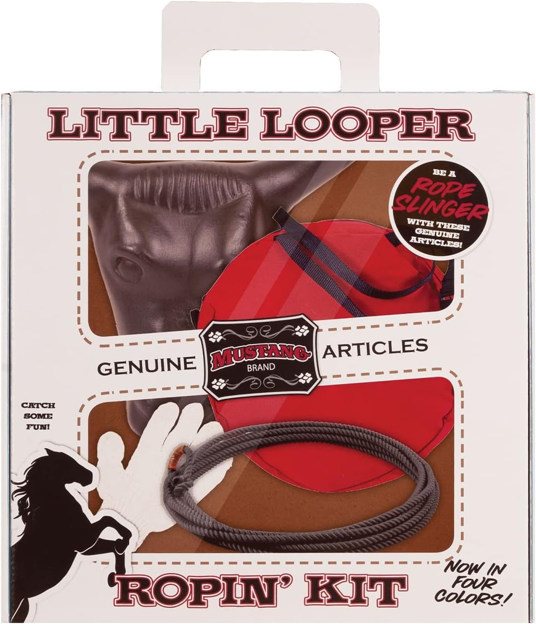 MUSTANG LITTLE LOOPER ROPIN' KIT: The Little Looper Ropin' Kit is a game set that will allow your cowboy or cowgirl to feel like real rope slingers. There is everything they need to get outside and start roping! This Mustang rodeo set for roping includes 5/16" x 20' Waxed nylon rope with a rawhide burner, Little Looper rope bag, cotton glove, and a junior steer head with hay bale spikes. MAIN FEATURES: - 5/16" x 20' Waxed nylon rope with a rawhide burner; - Little Looper rope bag; - Cotton glove; - Steer head with hay bale spikes; - Packaged in a box with handy carrying handles; MUSTANG MANUFACTURING BRAND: Mustang Manufacturing has been in business for over 40 years. Mustang specializes in custom-made saddle pads and cinches however, we offer an extensive line for all your tack needs. Such lines include nylon, poly, and rope halters, strung and rubber cinches, leg care, roping supplies, bridle sets, reins, barrel racing needs, stable supplies, training, and many other miscellaneous tack supplies. Each saddle pad and cinch is handcrafted and inspected to ensure accuracy and durability. (Intended for ages 15 years and older)