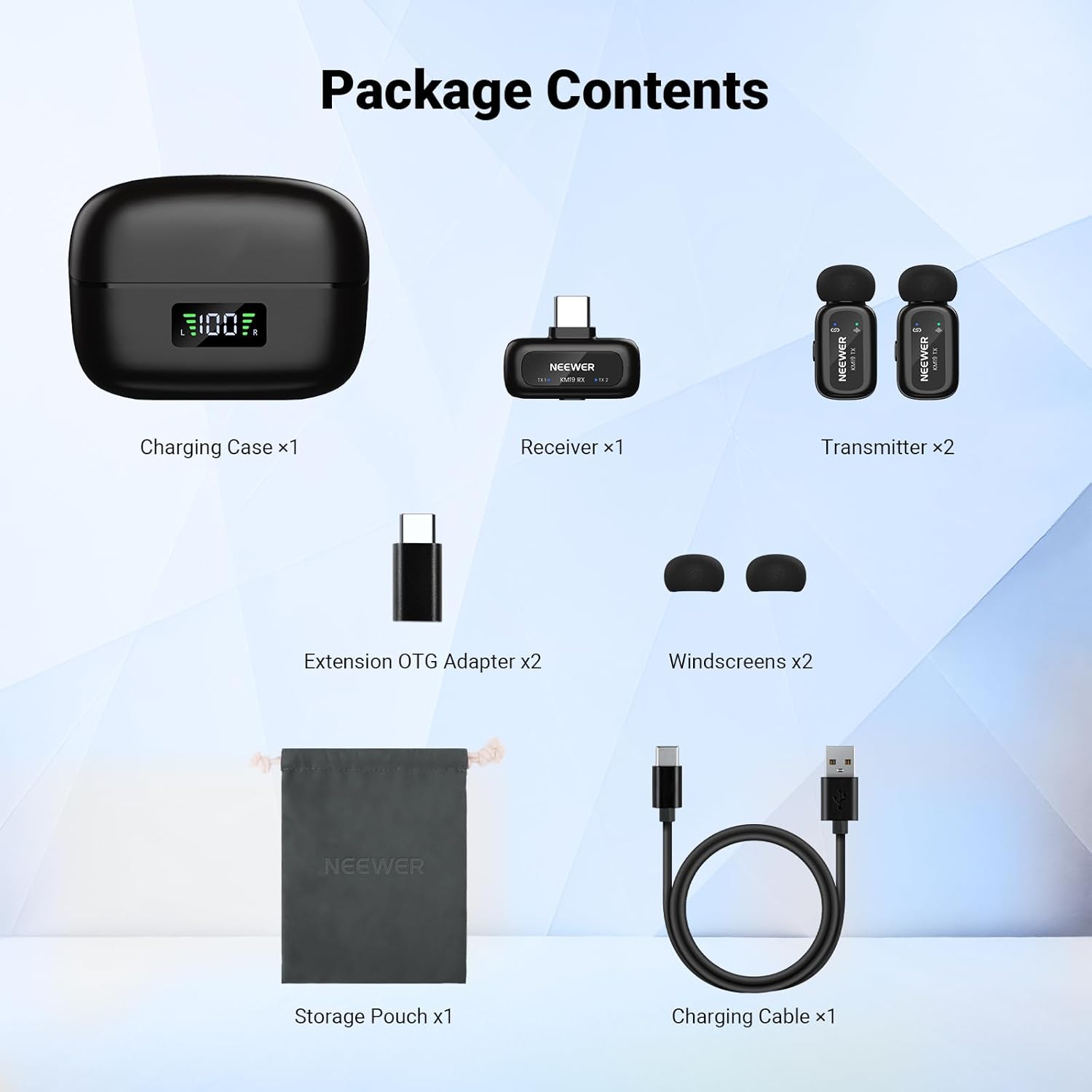 | BuiltIn Media | 1x Receiver, 2 x Transmitter ,USB C OTG Adapter, iOS OTG Adapter,, USB C to USB A Cable, 2 x Furry Windscreen, Pouch |