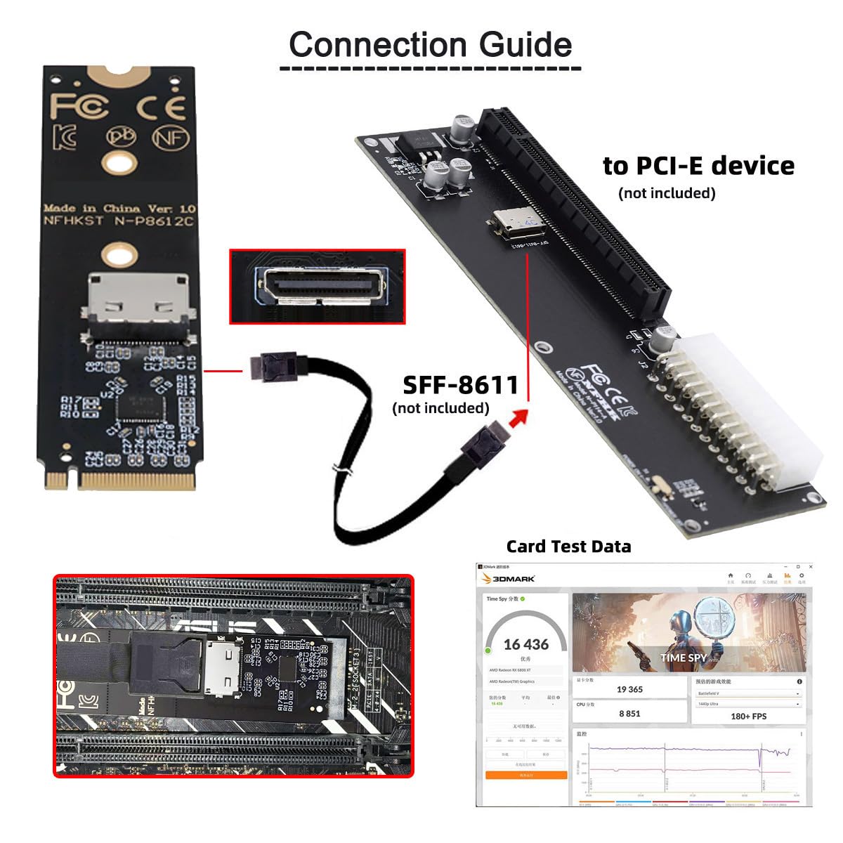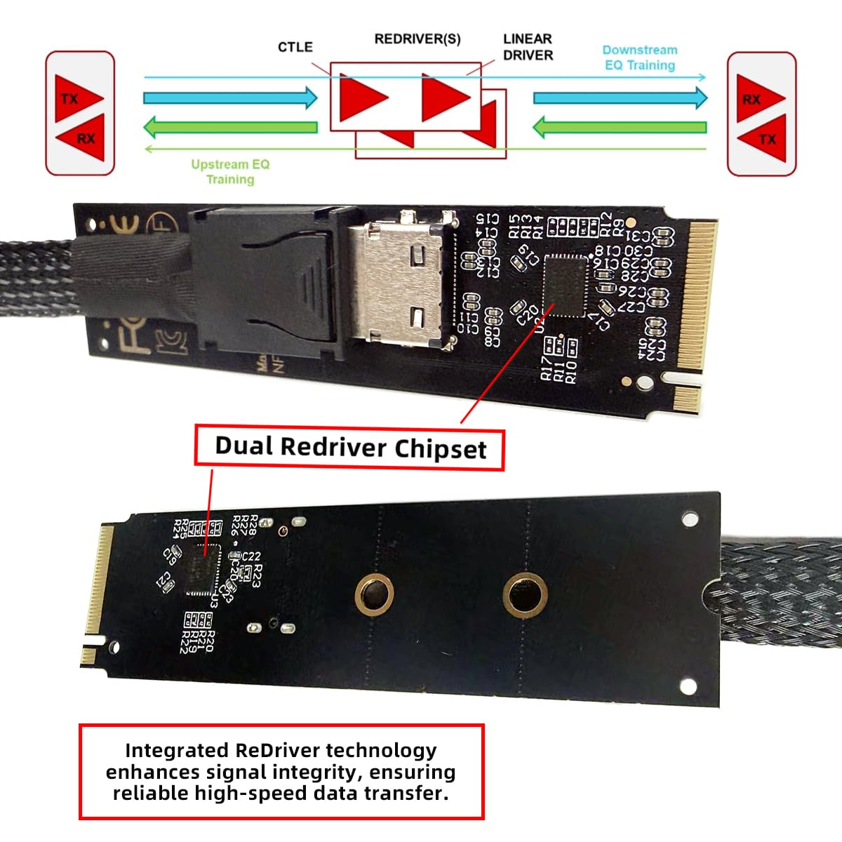 2280 PCI-E4.0 M.2 M-key to Oculink SFF-8612 SFF-8611 Vertical Host Adapter for NVME U.2 SSD eGPUThis convertor expands the 2280 M-Key system by one SFF-8612 oculink interface. It can be connected e.g. one SSD or eGPU Graphics Card by using an optional cable.The adapter features a built-in ReDriver circuit, which helps to boost signal quality and reduce noise interference over long cable lengths.The card transmits PCI Express 4.0 signals using the NVMe protocol.Data transfer rate up to 64Gbps, Supports NVM Express (NVMe) 1.2. This makes it suitable for use with the pci-e4.0 generation of high-performance SSDs and other PCIe Gen4 devices.Oculink 4x connectors are internal and external small form factor PCI-E connectors optimized for the client and market. Compatible with T10/ SAS-4 24 Gbps, SFF-8611, SFF-8612, PCIe Gen 3 and Gen 4.PX410 PCI-Express Linear Redriver is a four-channel, low-power, high-performance linear repeater/redriver designed to support PCI Express (PCIe) Generation 1.0, 2.0, 3.0, and 4.0. The device is a protocol-agnostic linear redriver that can operate for interfaces up to 25Gbps.Connectors: 1 x OCuLink SFF-8612 female and 1 x 67 pin M.2 Key M male.
