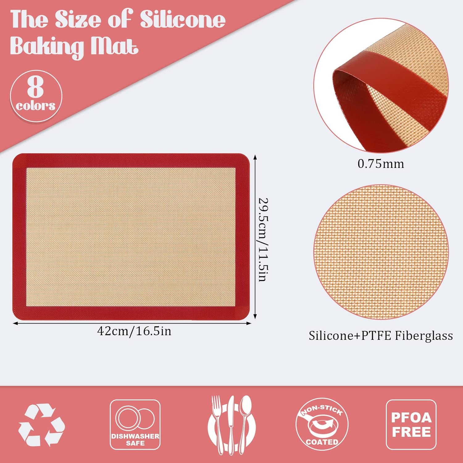 Features: The silicone reusable baking sheet liners are approx. 0.75 inches in thickness and they are suitable for professional bakers, beginners, families, DIY, schools, homes, kitchens, bakeries, restaurants, parties and more. The non stick half sheet silicone mats for baking can be nice and warm gifts for your family members, friends, neighbors, colleagues and other baking lovers on Mother's Day, Father's Day, housewarming, wedding and other holidays. Specifications: Material: silicone Brim color: gray, red, orange, yellow, green, blue, purple and pink Size: approx. 16.5 x 11.6 inches/ 42 x 29.5 cm Thickness: approx. 0.75 inches Package includes: 8 x Silicone baking mat Notes: Manual measurement, please allow slight errors on size. The color may exist a slight difference due to different screen displays.