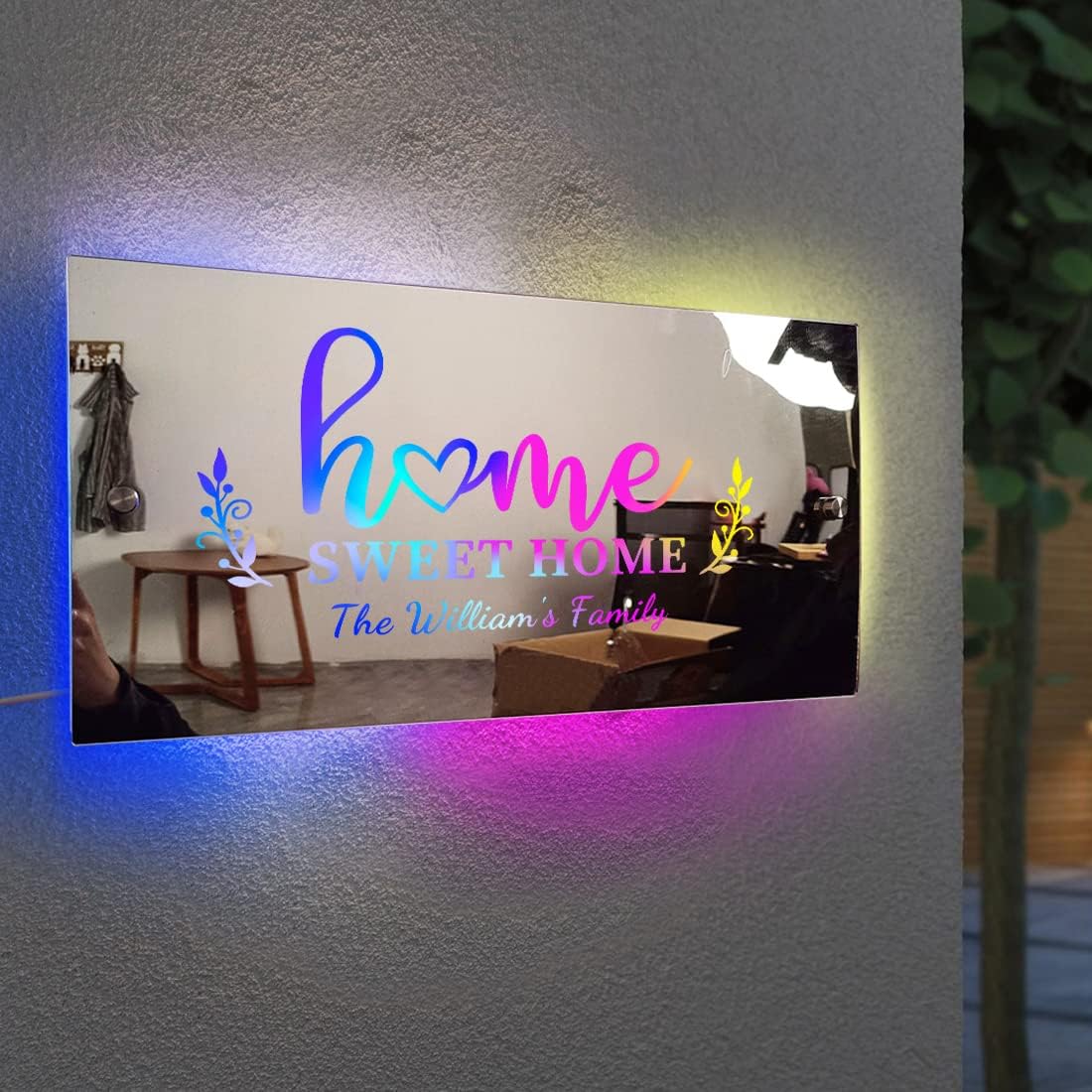 Great Personalised Gift: This is an 'all purpose' gift, perfect for Christmas,Anniversaries, birthdays and holidays. This multi-coloured LED name mirror light is ideal for creating an enchanting atmosphere in a study, room or playroom or as a unique night light for your family or friend. Light up Mirror Backlit Sign : Come home to the soft and gorgeous light of your very own illuminated sign lamp. Very suitable for creating a home-like feeling, but with some creativity, it is also very suitable for family bedrooms. Cast a soft and romantic light, making it the perfect gift for the upcoming holiday The perfect decorative light: Place the customised name mirror LED light perfect for home decor and can be placed in any of your interior rooms including bedrooms, children's rooms, gyms, cafes, bars. It will make an eye-catching home decoration with colourful modern LED neon lights creating your own unique style ambience. Mirror Material: The led mirror is made of mirrored acrylic material and it can be used as a unique decoration to add more beauty and vibrancy to your life. When placing the mirror on the table, you will need to remove the protective film from the surface of the mirror. The light of the mirror can be changed by the touch of a button. How to customise: 1. Choose the style you like. 2. Click on "Customise now" or "All purchase options", choose the size and customise the name and number. 3. "Add to cart" and pay: Satisfaction guaranteed: If you have any questions, please send us an email and we will get back to you within 24 hours and help you solve the problem to your satisfaction.