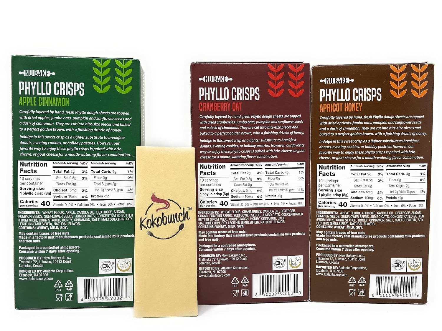 Phyllo Crisps Apricot Honey Phyllo Crisps Cranberry Oat and Phylo Crisps Apple cinnamon They are cut into bite-size pieces and baked to a perfect golden brown, with a finishing drizzle of honey. Indulge in this sweet crisp as a lighter substitute to breakfast donuts, evening cookies, or holiday pastries. However, our favorite way to enjoy these phyllo crisps is paired with brie, chevre, or goat cheese for a mouth-watering flavor combination.