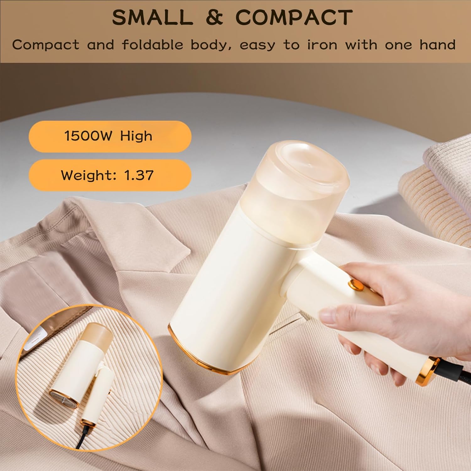 Product Features Surging Steam & Portability This professional clothing wrinkle remover has a high power of 1500W and can produce 16-18g/min of surging steam. When combined with a cleaning brush, it can quickly smooth out clothing wrinkles and remove dust from deep fibers of clothing.This steam ironing machine has a foldable body, a detachable water tank, and is lightweight. Whether it's for home storage or traveling, it won't take up a lot of space for you Precautions for Use 1. Please make sure to add water before use to avoid dry burning and extend the service life. 2.After use, please pour out the remaining unused water and wait for the panel to cool down for 30 minutes before storing it. 3.This portable steamer is only suitable for 110 volt areas, other areas require a voltage converter. Product Information Place of Origin: China Main Color: Beige Capacity: 168ml Main Material: ABS+PP+Stainless Steel Size: Expand 6.9 * 3.0 * 7.0 inches; Folding 6.9 * 3.0 * 4.1 inches Package 1 X Portable handheld steamer for clothes 1 X Water injection measuring cup 1 X Cleaning Brush 1 X Instructions 24-Hour Customer Service We provides excellent customer service. You can rest assured to buy our products, if you have any questions about the portable handheld steamer for clothes,please contact us, we will reply you within 24 hours and solve your problem.