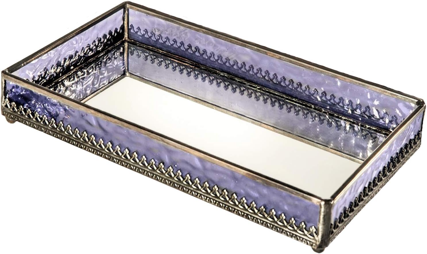 Elevate your vanity or dresser with the elegant Purple Stained Glass Vanity Tray by J Devlin Glass Art. This beautifully crafted tray features soft shades of purple stained glass with intricate filigree trim, creating a timeless, sophisticated look. The mirrored bottom adds depth and dimension, while the round ball feet provide stability and charm. Perfect for organizing jewelry, cosmetics, perfumes, or any small items, this tray combines both functionality and beauty. The antiqued metal trim and charcoal patina solder give the tray a vintage feel, while the wax finish ensures its durability and lasting elegance. Whether for your own home or as a gift, this tray brings both style and utility to any space. Dimensions: 9-3/8" x 5-3/8" x 1-1/2" Key Features: BEAUTIFUL STAINED GLASS TRAY – Elegant soft purple stained glass with filigree trim for a sophisticated design. MIRRORED BOTTOM – Adds dimension and enhances the tray's visual appeal, perfect for organizing cosmetics and jewelry. VERSATILE STORAGE – Ideal for use on vanity tables, dressers, or countertops to hold perfumes, jewelry, and small items. ANTIQUED METAL TRIM – Features a charcoal patina and wax finish for a vintage, classic look that lasts. COMPACT AND FUNCTIONAL – The round ball feet provide stability while the tray adds beauty to any space.
