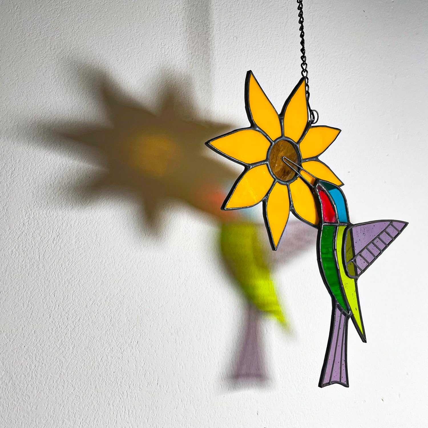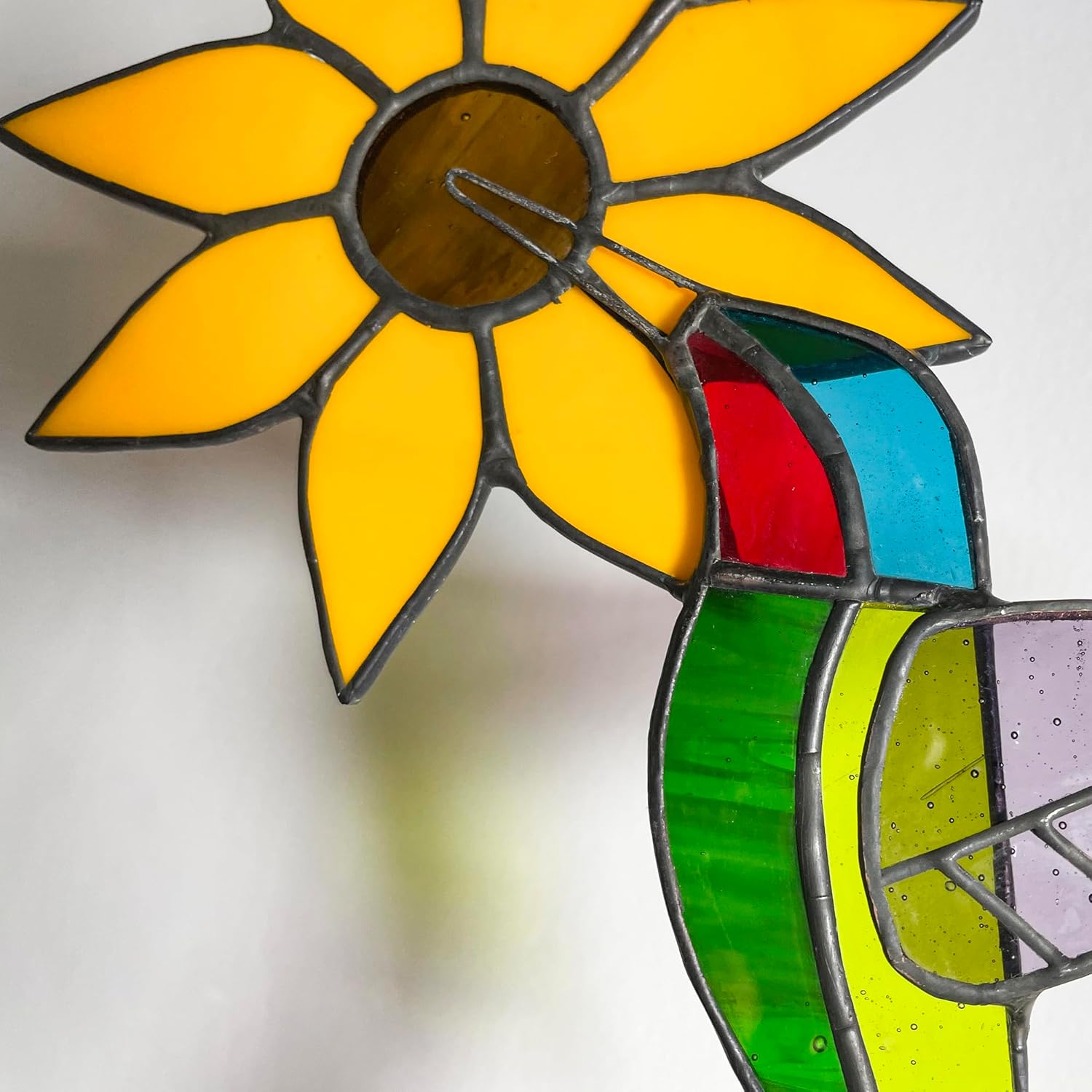 STAINED GLASS MATERIAL: Our Sun Catchers boast genuine, handmade stained glass that is not only visually stunning but also fire and high-temperature resistant.Crafted from high-quality materials, our products ensure an exceptional and long-lasting experience. WINDOW SUNCATCHER: Capture the sun's brilliance with our captivating Stained Glass Birds. Whether adorning your window or gracing your bedroom, these vibrant and colorful pieces add a touch of brilliance and elegance to your home. LIFELIKE HUMMINGBIRD: Immerse yourself in the beauty of our Stained Glass Suncatchers with their incredibly realistic sunflower and hummingbird design. The bright and enduring colors exude a radiant ambiance while being easily cleaned with a simple wipe. PERFECT GIFT IDEA: Share the joy and good vibes with our Suncatcher – an ideal gift for sunflower enthusiasts, your loved ones, and especially cherished moms. Brighten their day with this thoughtful and heartfelt present. IDEAL SIZE:Our Animal Sun Catchers measures 4.33*7.09 inches (including the chain) . The accompanying metal chain allows you to hang it effortlessly in any desired location.