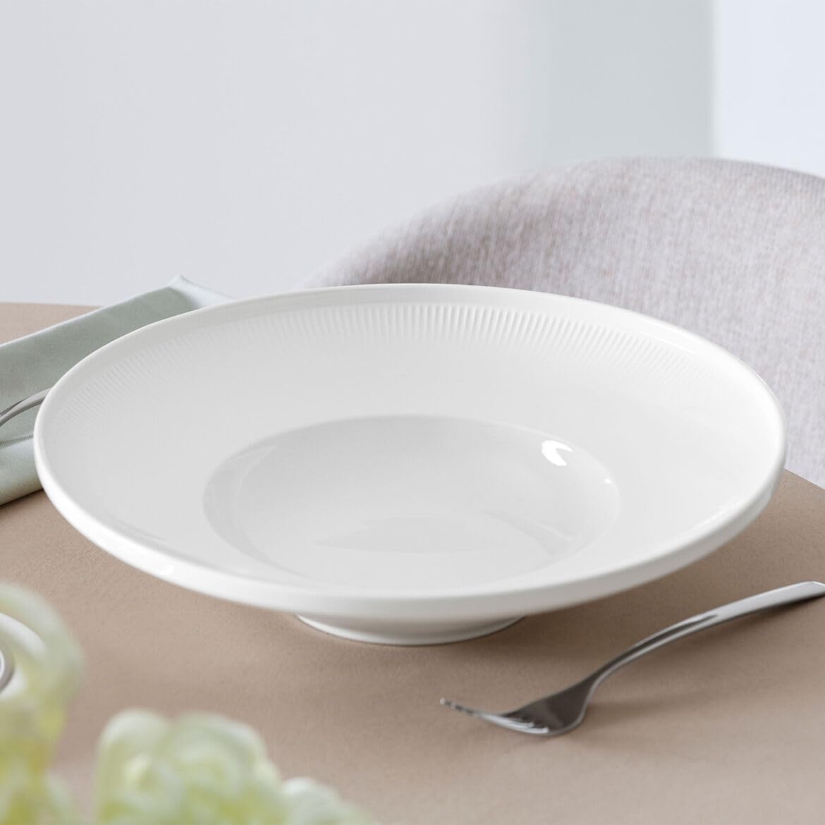 In a world engaged in a quest for both unique and relaxing spaces, we are presenting the Afina tableware collection inspired by the lifestyle trend of sophisticated taste. The collection features a unique design concept combining minimalist shapes with delicate, carefully crafted details. The clear shapes come together perfectly with fine details to create a modern coupe shape with a raised rim. Inspired by concentric rays of sunshine, this tableware features a fascinating ring-shaped relief that creates an exquisite tactile experience. The special floating appearance is emphasized by a carefully concealed base area. The deep plate with a large diameter is ideal for attractive presentation of a wide variety of dishes. With its spacious dimensions and stylish design, it will add a touch of elegance and sophistication to every menu.